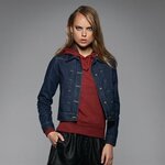 Women's iconic and fashionable denim trucker jacket. 100% denim cotton, garment wash. Metallic buttons in antique brass. Front folding with bartacks to reinforce DNM RAW look. One front ticket pocket with flap and button with decorative reinforcement stitch. Single button cuffs. Two small foldings on back for a feminine look. Decorative button on waistband at backside. Contrast stitching.