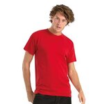 Short-sleeved T-shirt. Generous cut with tubular construction. Exact 2-ply crew neck, 1x1 ribbed collar with Elastane.