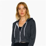 A unique twist on our classic hoodie featuring a cropped midsection that hits right at the bellybutton. Metal zipper. Hooded with White finished Polyester drawcord. True to size.