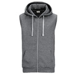 Sleeveless zipped hoodie with metal YKK zipper. Twin needle stitching detailing. Double fabric hood. Contrast flat white drawcords. Hanging loop at back neck. Kangaroo pouch pocket. Right hand side pocket has small hidden opening for earphone cord feed. Hidden ear phone loops. Ribbed binding detail around armhole. Ribbed hem. Soft cotton faced fabric creates ideal printing surface. Simple tear out label makes it prefect for rebranding. Worldwide Responsible Accredited Production (WRAP) certified production.