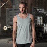 Peach-finish. Modern fit Tank Vest with contrast herringbone back neck taping. Flat lock side seams. X stitch detail at front neck and tear-off back neck labelling for ease of rebranding.